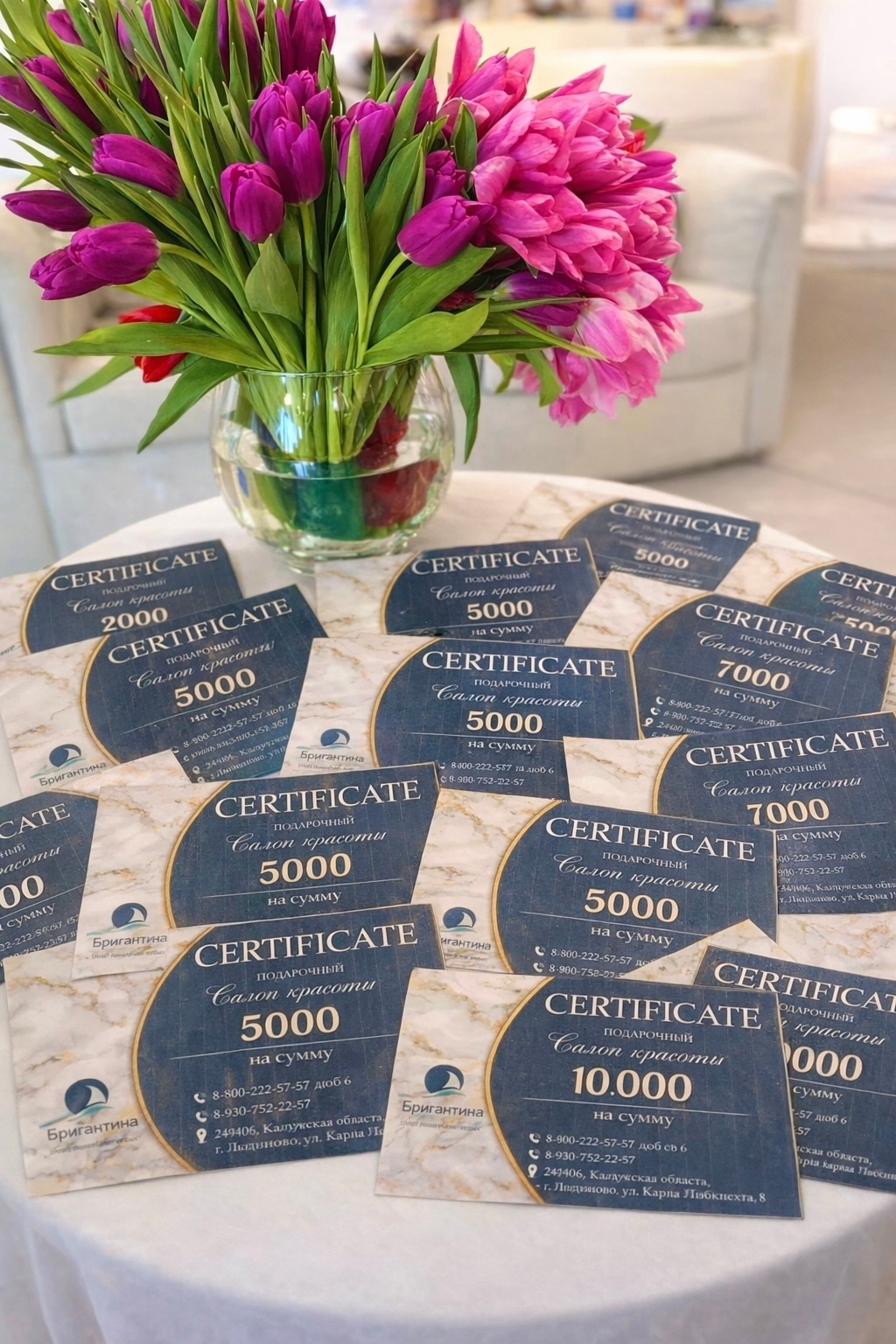Просто заходите в наш салон «Бригантина» или свяжитесь с нами по телефону. Наши администраторы с радостью помогут вам с выбором номинала сертификата и ответят на все вопросы.